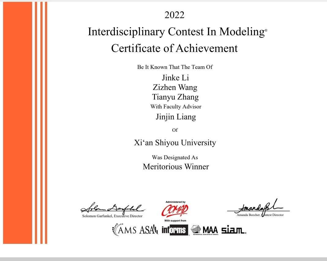 2022年2月18日至22日举办的美国老员工数学建模竞赛已经落下帷幕,在这次比赛中,公司教师竞赛指导方面实现了新的突破,李金科、王子禛、张天雨三位同学在学院教师梁锦锦的指导下,不负众望,以优异的表现喜获一等奖(M奖,Meritorious Winner)。