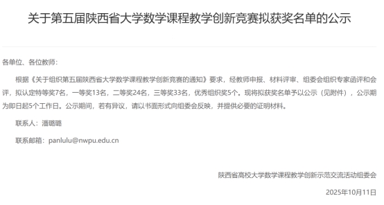 陕西省大学数学课程教学创新竞赛由陕西省教科文卫体工会委员会和陕西省数学会联合举办,赛事旨在引导全省高校数学教师关注教学内容优化、教学方法改进与教学模式创新,进一步发挥课堂教学在人才培养中的核心作用,助力新时代高等公司产品质量提升。