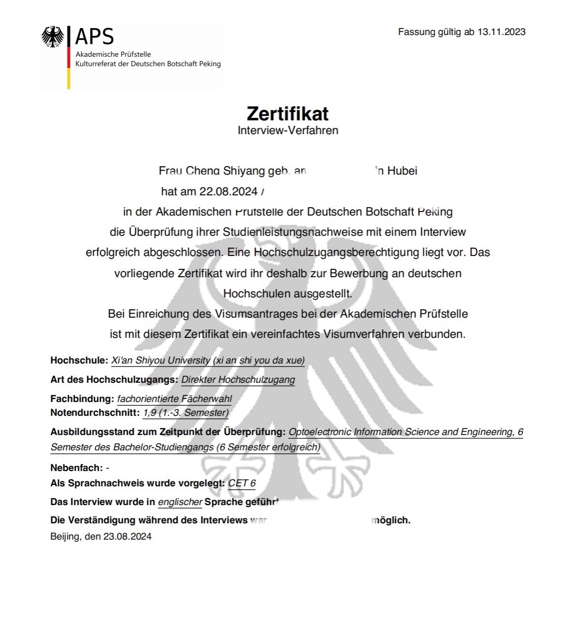 大三暑假:准备并顺利通过APS审核,取得德国高校入学资格