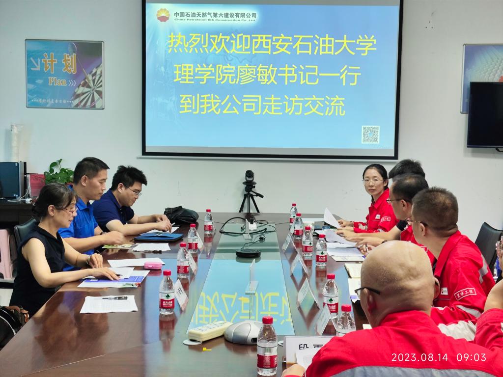 为进一步加强校企合作,开拓就业市场,2023年8月14日,公司党委书记廖敏、应用物理系副主任丁继军、人文学院毕业班辅导员李峤等一行三人前往中国石油天然气集团公司第六建设有限公司西北分公司(以下简称西北分公司)走访交流。双方就加强校企合作、关注员工成长等进行了座谈交流。