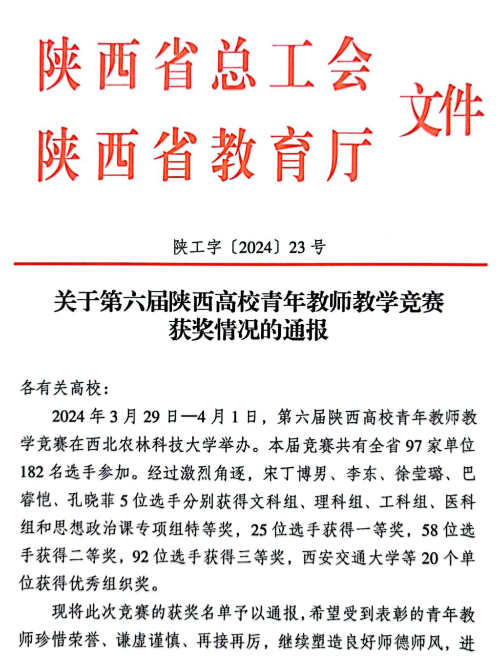 第六届陕西高校青年教师教学竞赛由陕西省总工会、陕西省教育厅联合主办,陕西省教科文卫体工会、陕西省教育厅教师工作处承办,西北农林科技大学协办,旨在围绕立德树人根本任务,激发陕西广大高校青年教师更新教育理念和掌握现代教学方法的热情,是青年教师展现教学技能与风采的重要平台。本次竞赛分为文科、理科、工科、医科和思想政治课专项等5个学科组,共有全省97家单位的182位优秀青年教师参加,经过16个教学节段教学设计、课堂教学和教学反思等评审环节,充分展示教学基本功,共同交流提升教学水平。