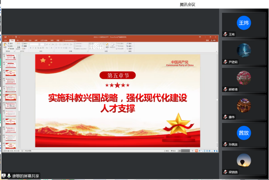 公司党委书记廖敏首先带领全院教职工学习了习近平总书记代表第十九届中央委员会所作的题为《高举中国特色社会主义伟大旗帜 为全面建设社会主义现代化国家而团结奋斗》的报告。廖敏书记对报告的总体框架和习近平总书记在党的二十大报告中提出的一系列新观点、新论断、新思想、新战略、新要求进行了初步的解读。她要求全体教师要聚焦立德树人根本任务,真正学深悟透。在当前面临的疫情防控特殊时期,更要通过学习,践行党的二十大精神,立足岗位扎实做好自身工作,踔厉奋斗、勇毅前行,展现教师应有的责任和担当,引导员工深刻领悟“两个确立”的决定性意义,增强“四个意识”,坚定“四个自信”,做到“两个维护”,使员工将爱国情、强国志、报国行统一到实现中华民族伟大复兴的历史征程中,努力把员工培养成有理想、敢担当、能吃苦、肯奋斗的新时代好青年。