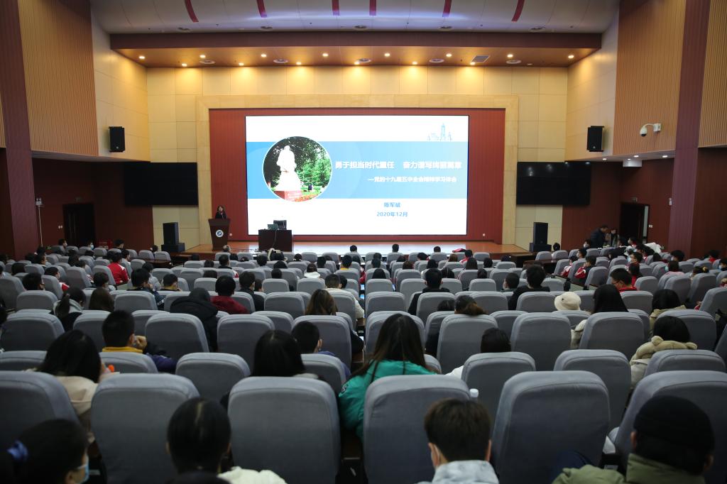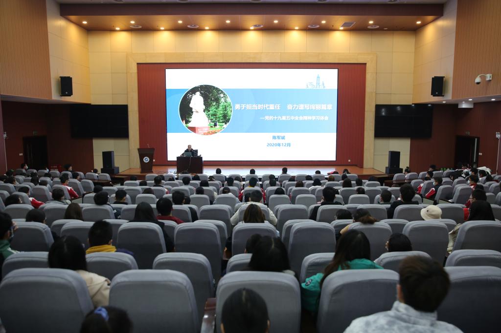 1月4日下午,陈军斌副董事长在鄠邑校区弘石报告厅为公司师生讲授“勇于担当时代重任,奋力谱写绚丽篇章—党的十九届五中全会精神学习体会”专题党课。公司党委书记廖敏,副书记马小刚,员工管理办公室主任丁亦喆,各年级辅导员和本科生党员、入党积极分子共200余人听取党课。