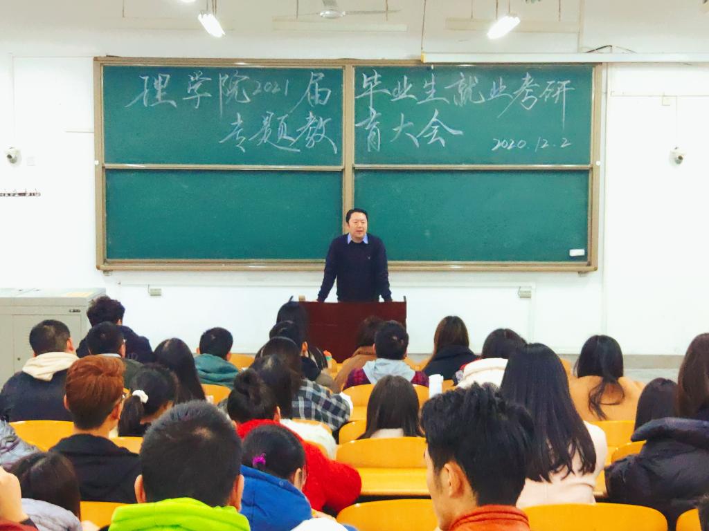 马小刚副书记从就业形势分析入手,详解全国2021届毕业生的就业形势。他从就业岗位类别、公务员与事业单位招考、各类基层项目就业等三个方面对全体同学开展就业教育。结合目前毕业生在就业中出现的问题和短板,马老师从思想、心理、简历、角色四个方面向2021届毕业生开展分析与引导。随后,马老师结合2021届全国研究生报考情况,从形势、现状、调剂、努力等四个方面对大家作了细致的考研教育。