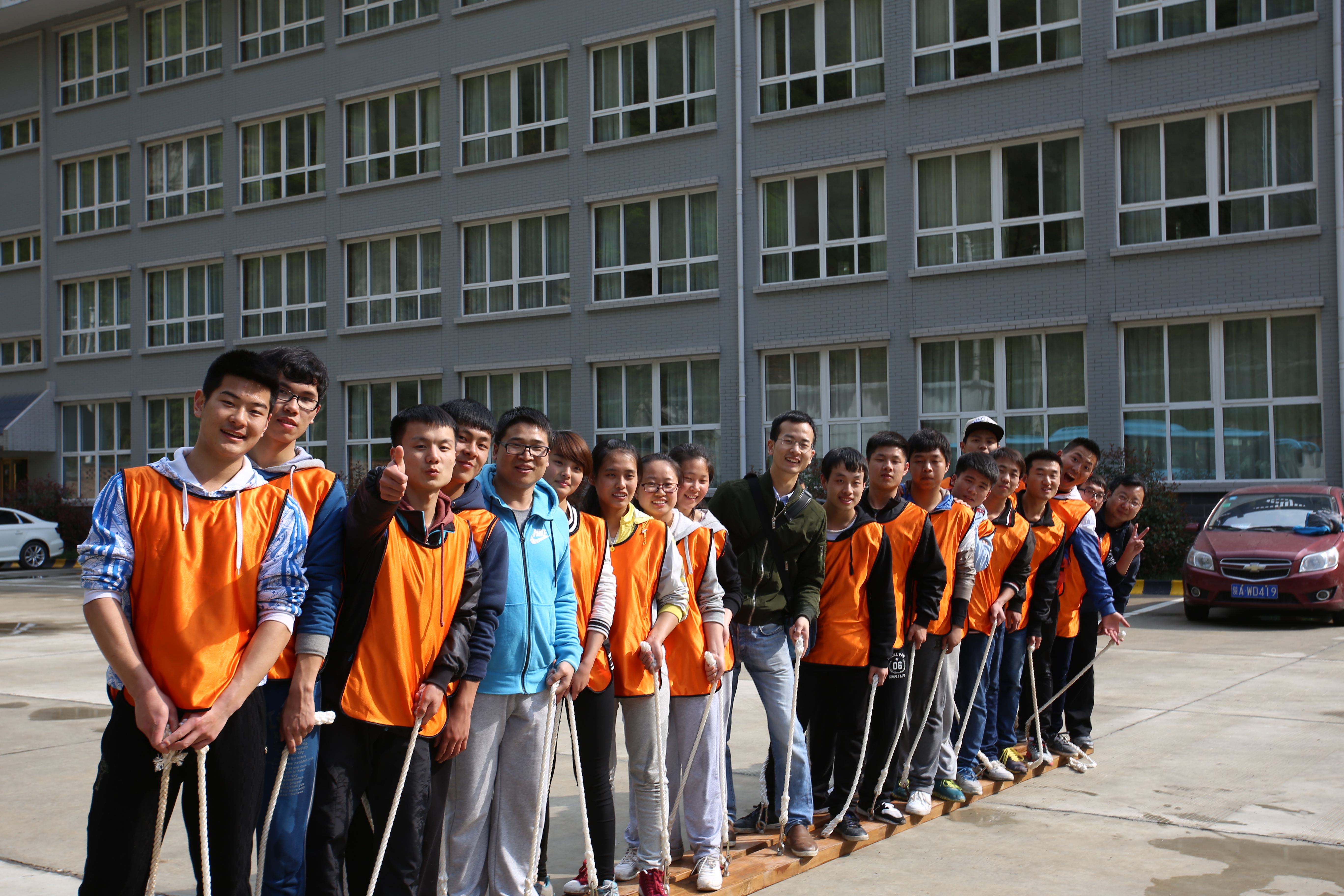 午饭后,同学们迎来了此次素质拓展活动的重头戏“空中断桥”,地面上短短1.2米的距离在8米的高空中却令人胆战心惊,这是一个极具挑战又极需团队 合作的高空项目,它需要的是对队友的完全信任,对团队的高度负责,尽管过程危险又困难,但是大家互相帮助,最终每个人都顺利完成挑战。紧接着进行“木屐行 走”项目,这考验的是团队合作能力,比拼的是体力与耐力,经过适应性训练后,两队展开较量,大家相互鼓励,在竞争的氛围中圆满完成了比赛。