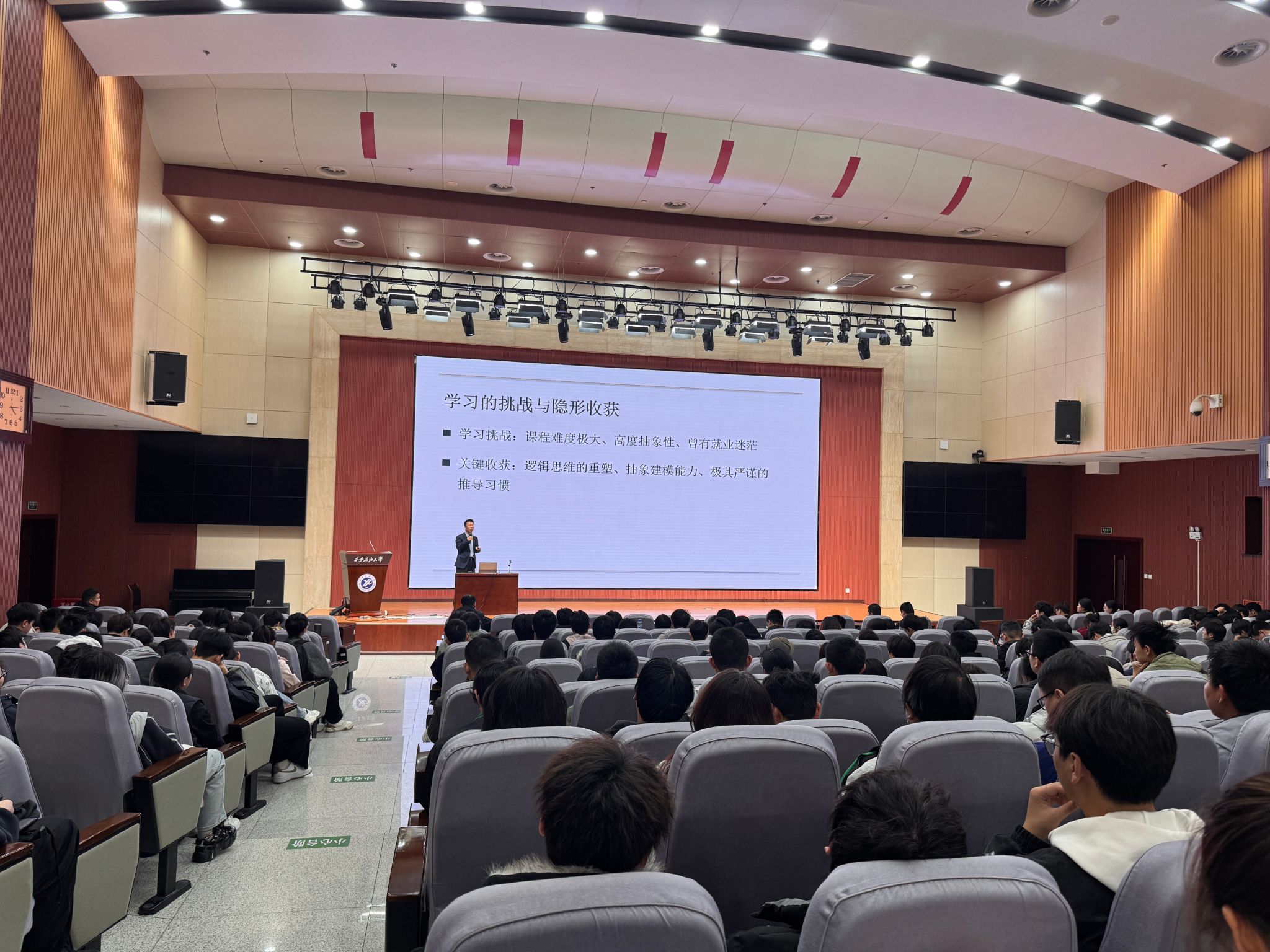 讲座中,叶坤教授真诚分享了自己从数学跨入航空航天领域的求学历程。他讲述了在跨专业备考过程中如何以数学底子为依托,弥补工程学科知识空白,并在硕博八年中直面论文被拒、项目受阻等挑战,始终坚持深耕所热爱的专业领域。他以自身经历鼓励学子:“跨界不是放弃过去,而是让过去成为独特的优势。”叶坤教授围绕学业发展与人生规划提出六条具体建议:定方向、打基础、强身体、管时间、拓视野、稳心态。他特别强调“身体是革命的本钱”,指出长期高强度的科研工作离不开强健的体魄和稳定的心态。他还结合数学学科特点,指出“数学+X”的复合型人才在未来具有广阔发展空间,鼓励同学们守住专业底气,主动拓展交叉能力。