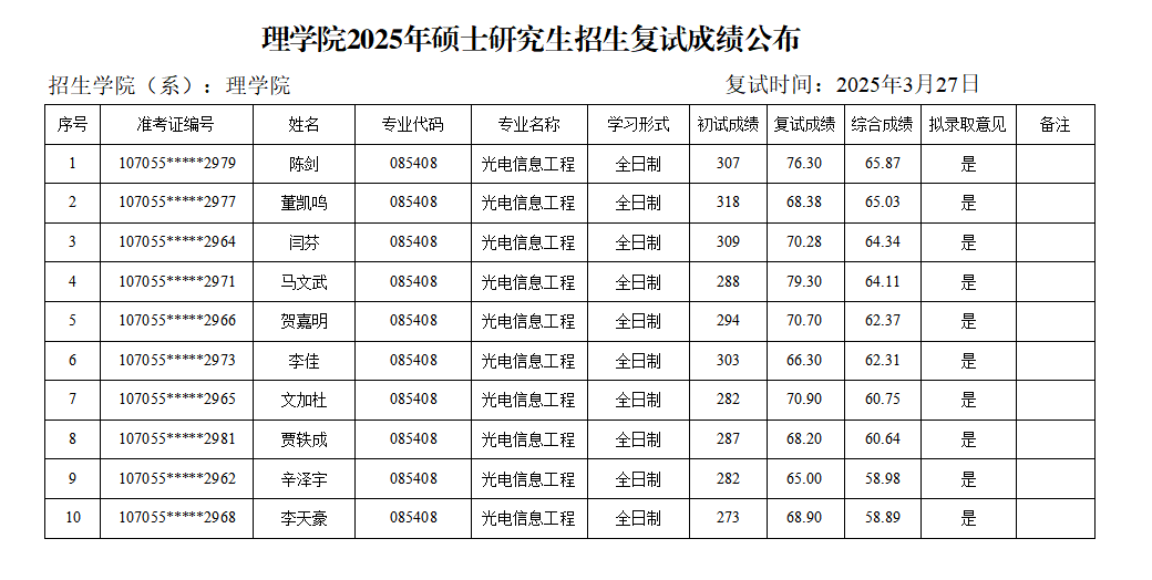 年硕士研究生招生复试成绩(一志愿考生)予以公布,如有异议,请联系(029)