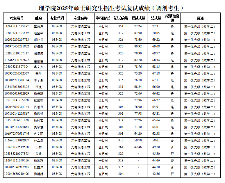 永利yl234112025年硕士研究生招生复试成绩公布(光电信息工程调剂考生)(第一批)